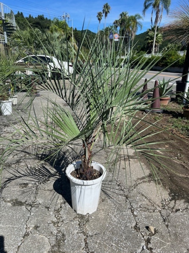 和名:ヤタイヤシ、ブラジルヤシ 別名:ココスヤシ 学名:Butiayatay、Butia capitata 鉢サイズ 根巻発送となります。※鉢は付属しません。 幹高 約30cm 全高:地上部 約160cm程度 耐寒性がある人気のヤシ 葉柄が弧状に外側に湾曲してそり返る。大きな羽状複葉で葉の下面が帯灰緑色となり、全体が白っぽく見える。雌雄同株。果実は食用になる。羽状葉のヤシではもっとも耐寒性が強い種類で、-8℃でも異常がない。零下20℃でも枯死しないと言われる。 耐寒性 耐寒性が非常に強く、成木なら-10℃位まで耐える。 クライメートゾーン8b以上の地域に植栽可能 成木 4.5m - 6m ※お送りする植物は同等サイズのものをお送りいたします。 ※根巻での発送となります。鉢は付属しません。 ※沖縄県離島のお住まいのお客さまへ 送料ですが、沖縄本島までの送料は自動的にご購入時に送料が加算されますが、 沖縄本島~沖縄離島への中継送料が含まれておりません。 誠に申し訳ございませんが、システムの都合上、追加中継送料分の決済は【銀行振込】のみ 対応となります。その際は当店よりご連絡をさせて頂きますので、ご対応宜しくお願い 致します。 お手数をおかけしますが、ご理解の程よろしくお願いいたします。